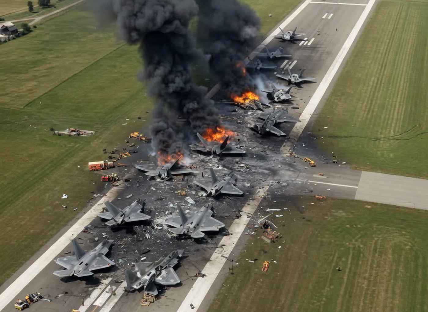 Aerial view of multiple fighter jets destroyed and burning on an airfield runway with