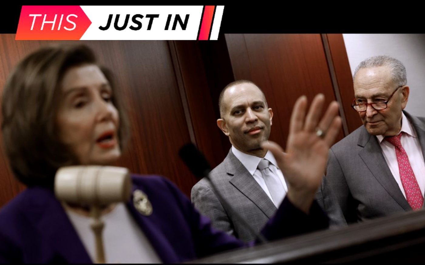 Nancy Pelosi speaking at a podium with a gavel, with Hakeem Jeffries and Chuck Schumer