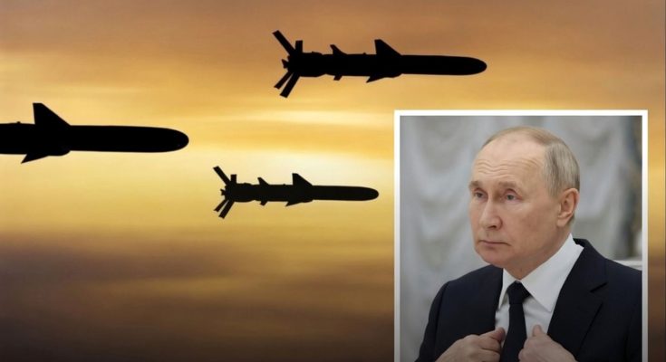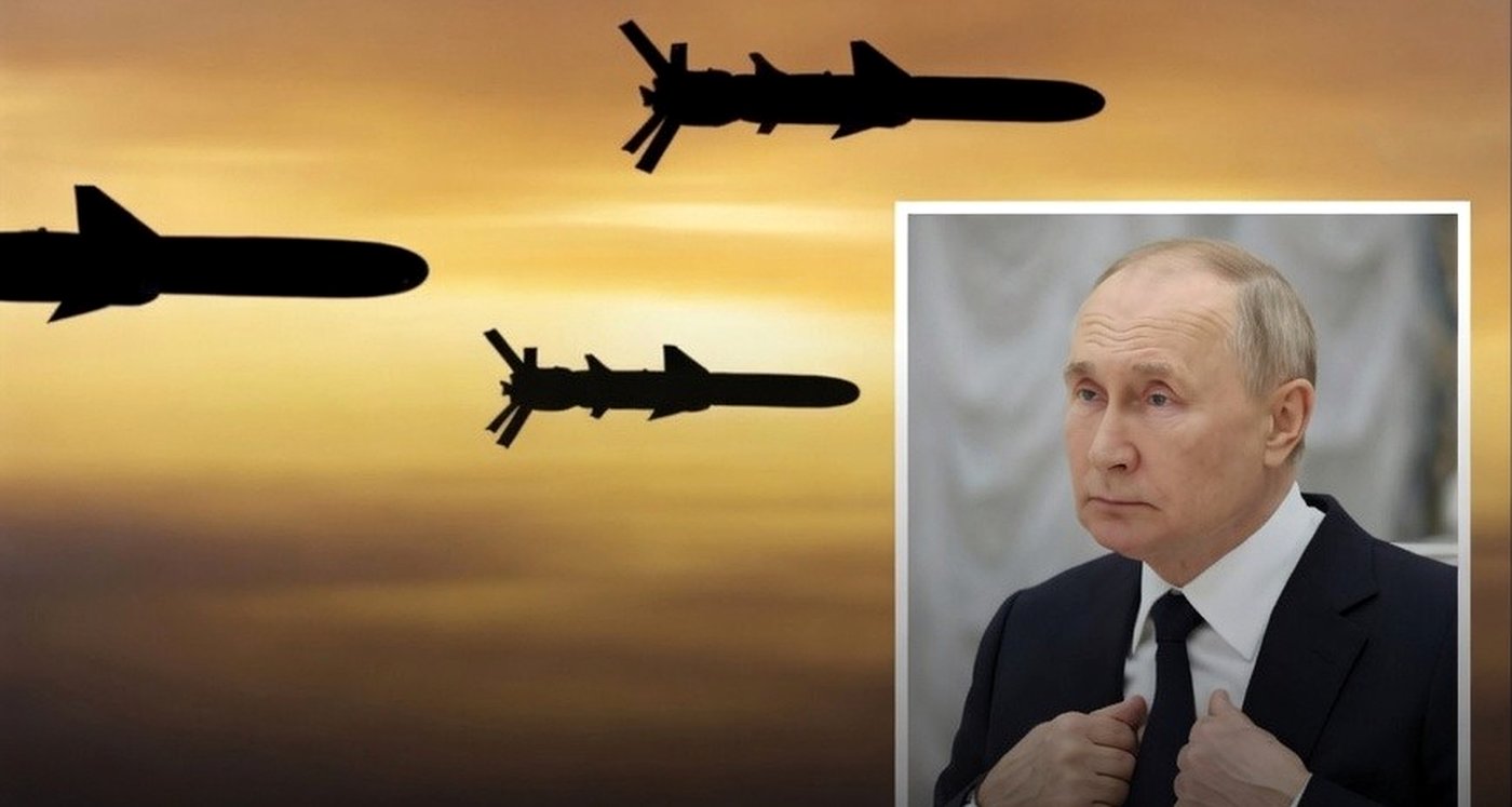 silhouette missiles at sunset, Putin inset, WW3 nuclear tensions