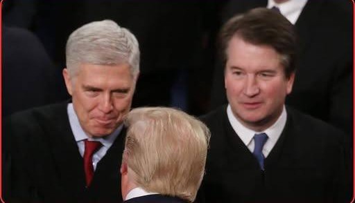 Donald Trump seen from behind with Neil Gorsuch and Brett Kavanaugh in judicial robes