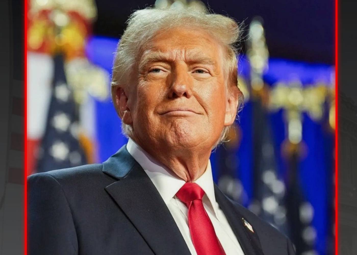 Donald Trump wearing a dark suit, white shirt, and red tie, with American flags visible