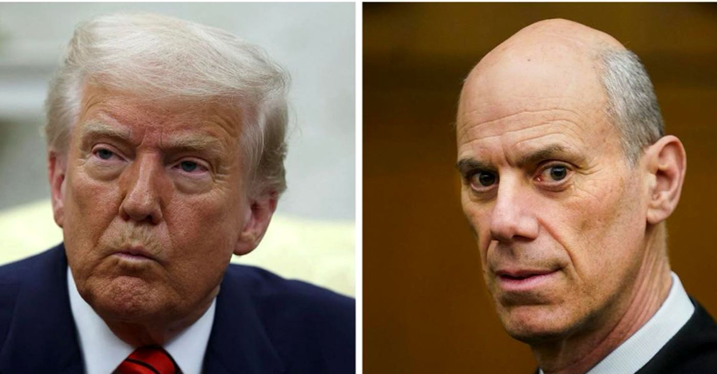 Side-by-side portraits of Donald Trump and a bald man with gray hair at the temples