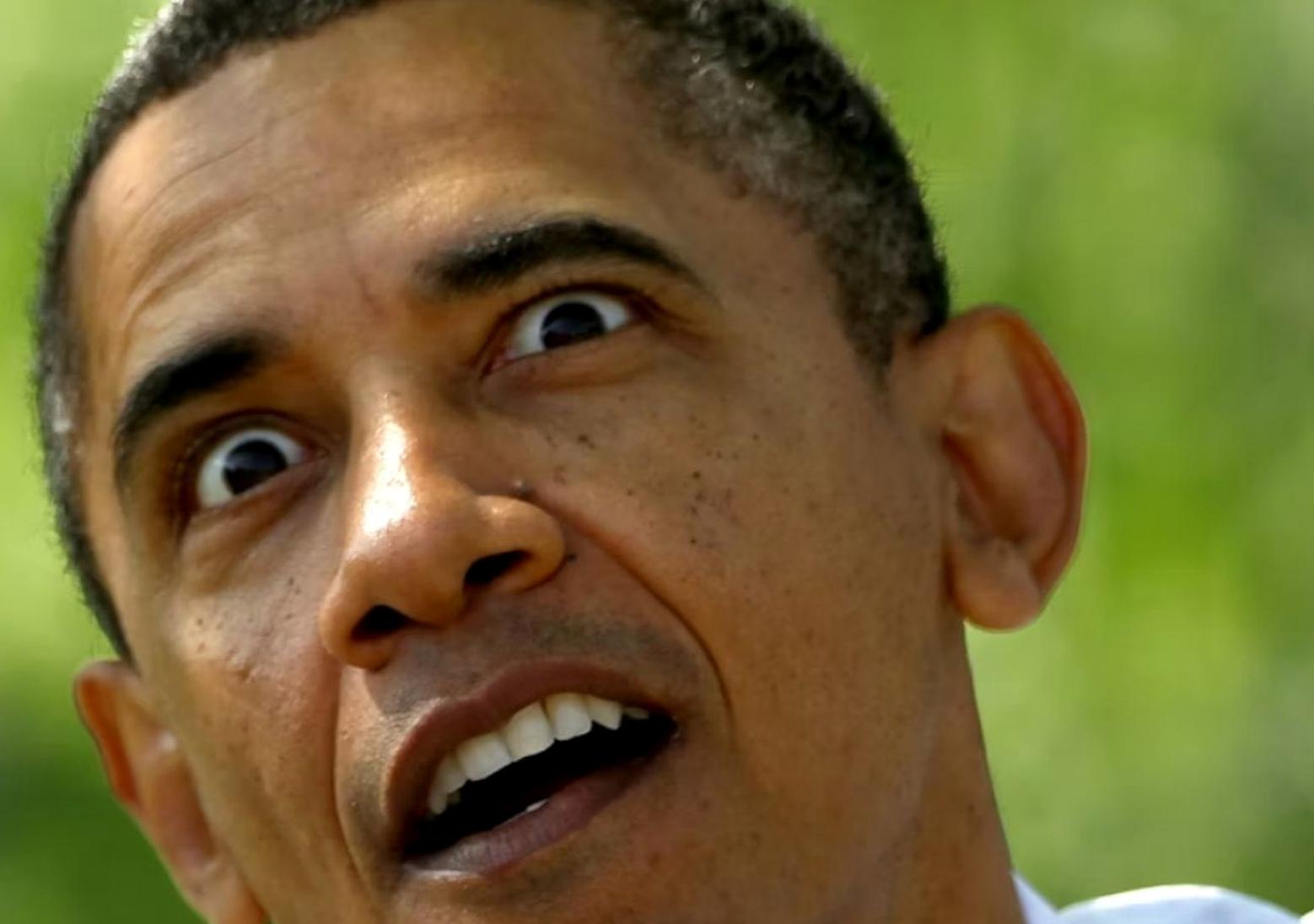 close-up of Barack Obama looking upward with surprised expression and bold on-image text