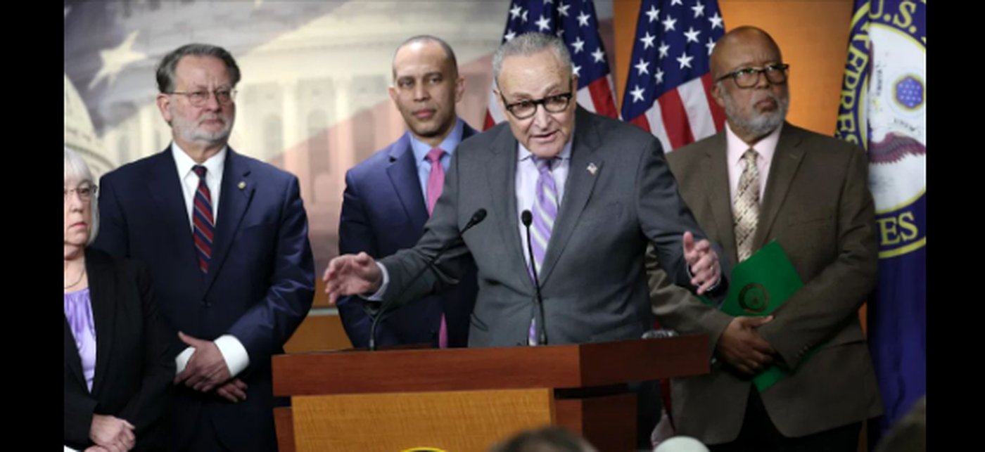 Chuck Schumer speaking at a podium with four other people standing behind him, American