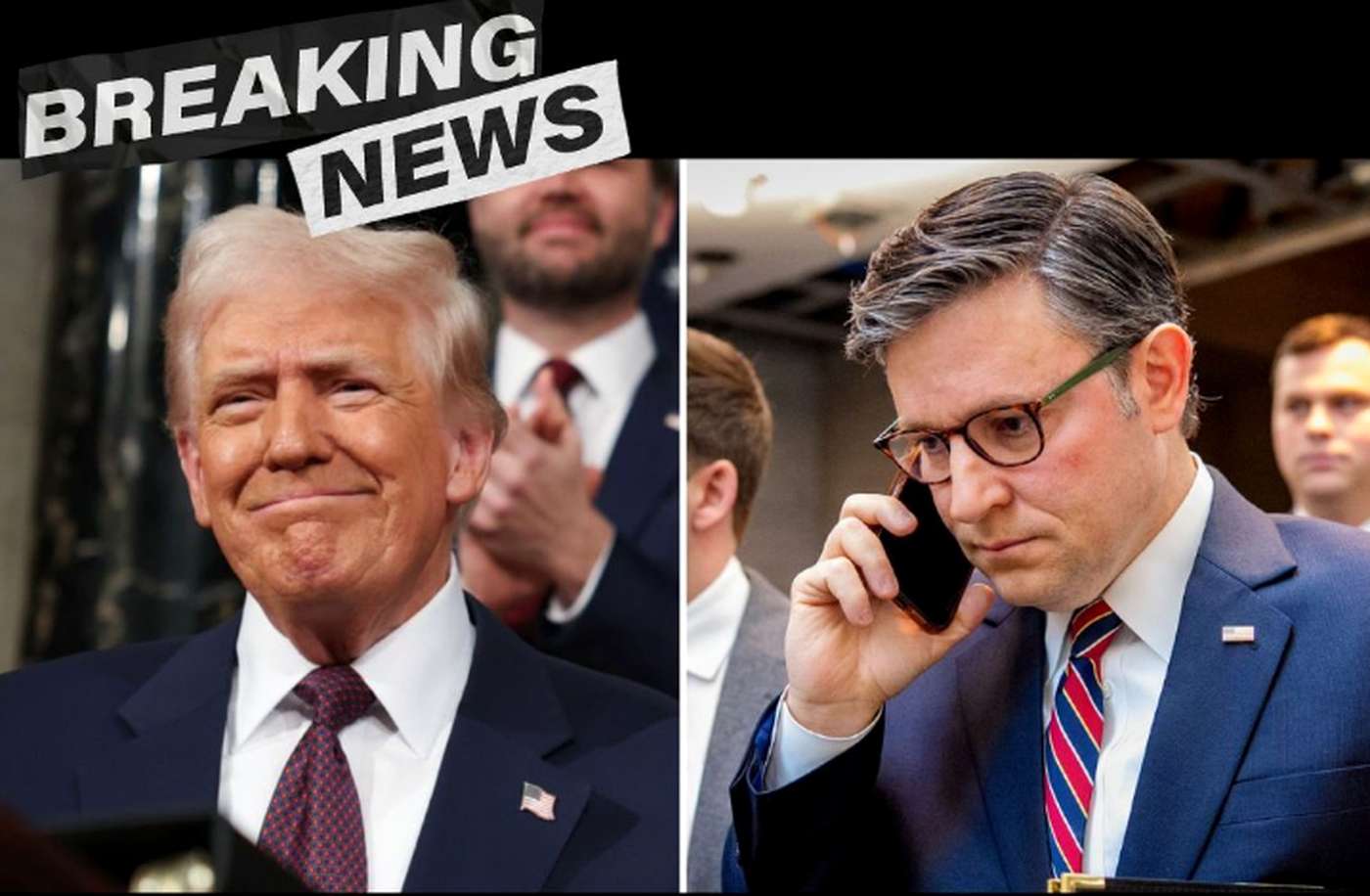 Split image showing Donald Trump smiling on the left and Mike Johnson talking on a phone