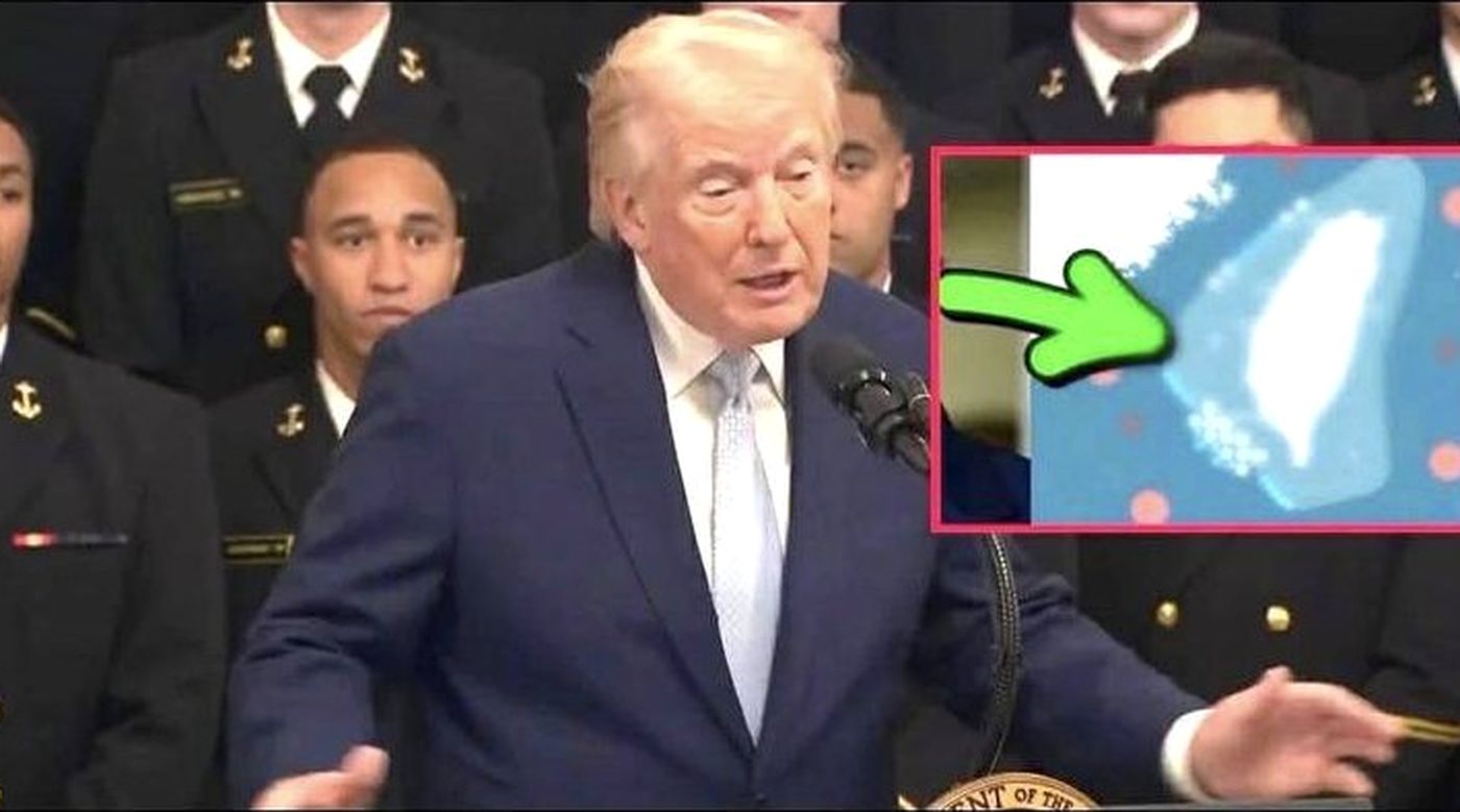 donald Trump speaks at a podium with uniformed personnel behind him, while an inset